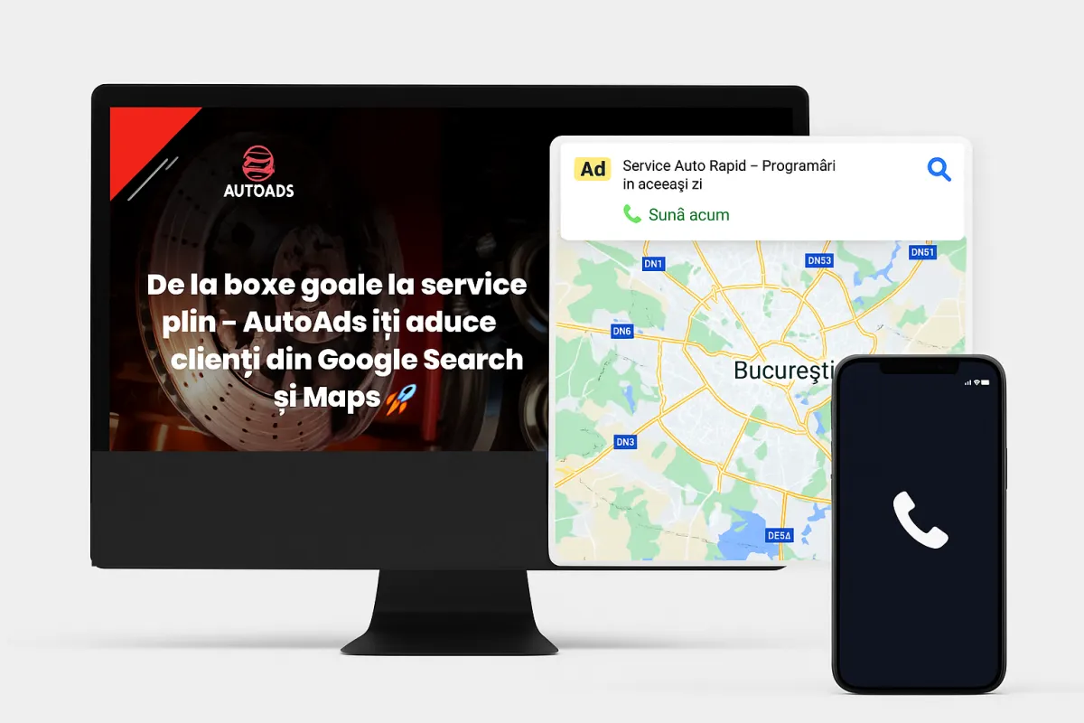 Configurăm campanii inteligente în Google Search & Maps, optimizate să aducă apeluri, programări și mesaje direct din telefon.